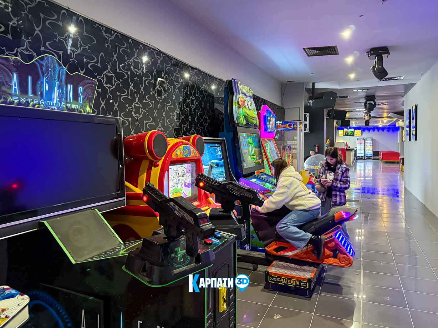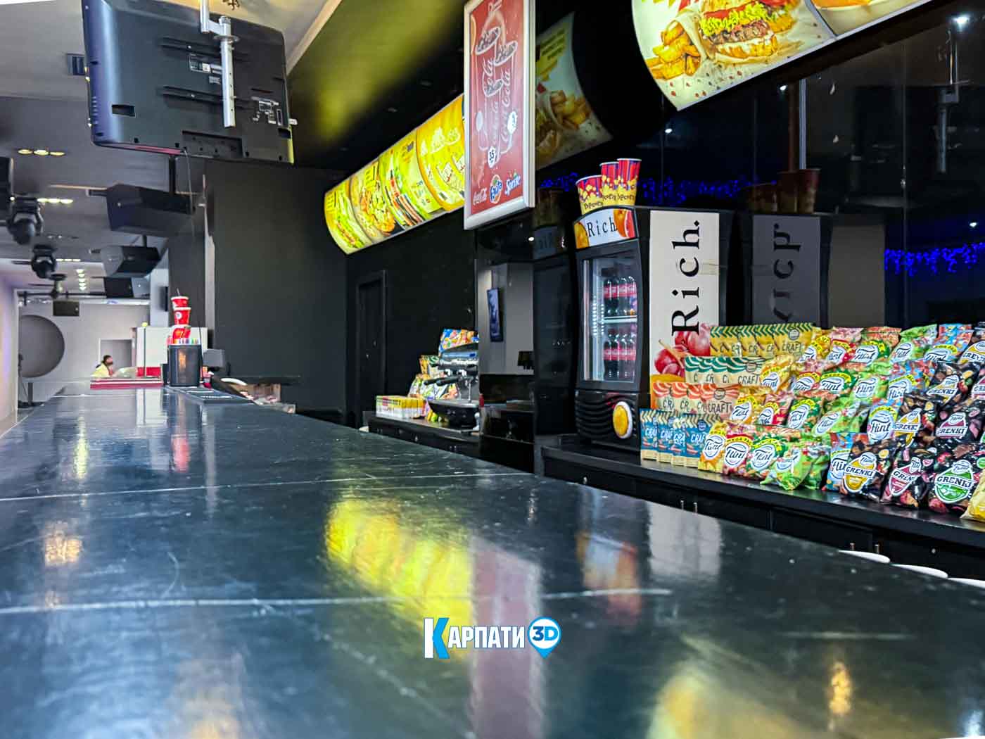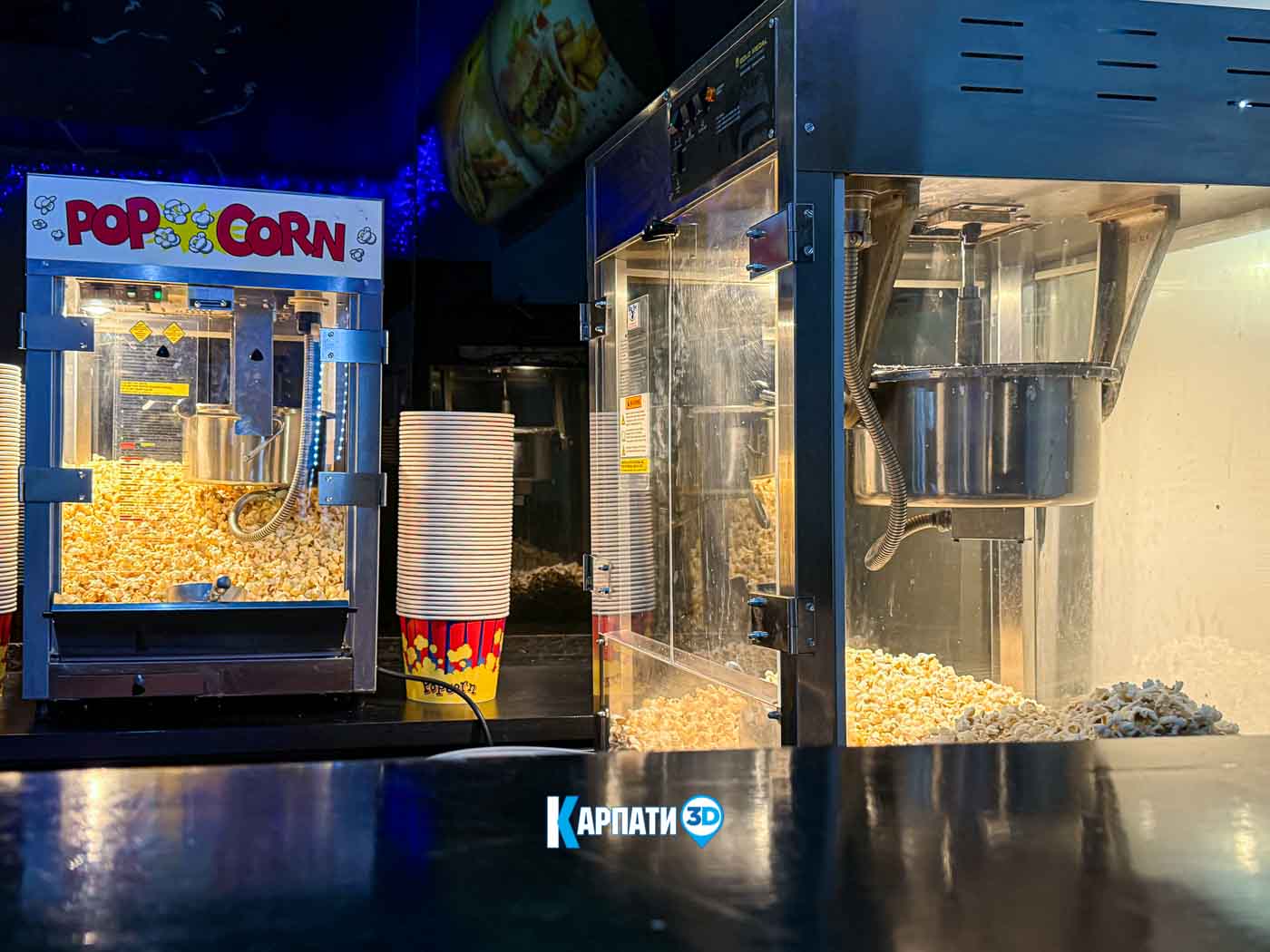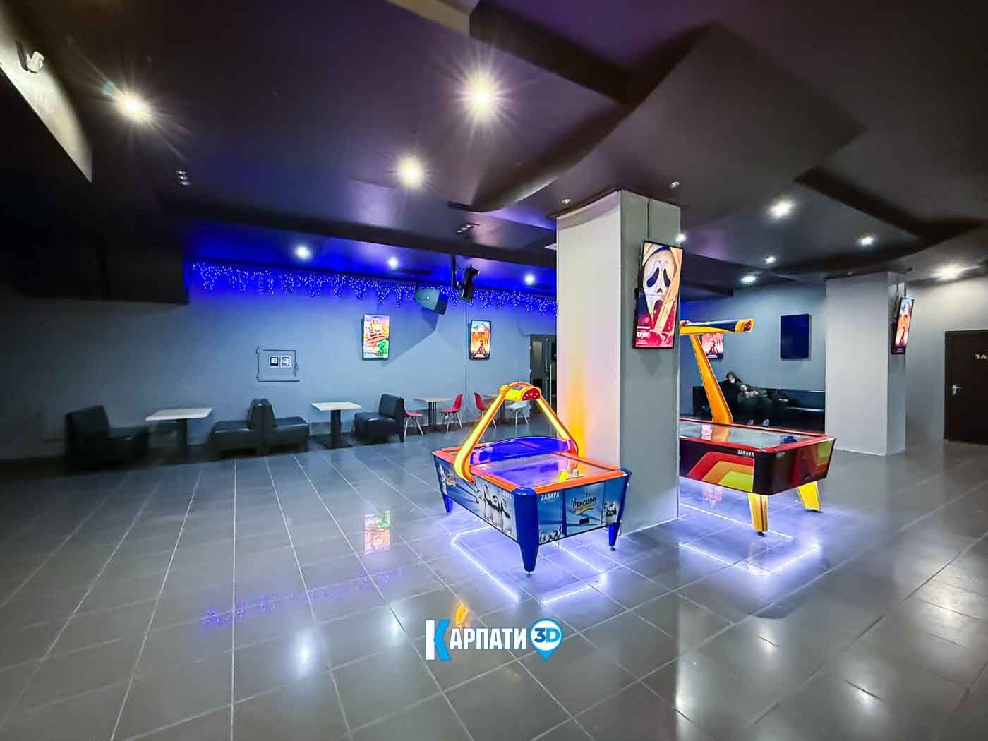 У просторому фоє працює кінобар, де гості можуть купити улюблений попкорн, горішки, чіпси, прохолодні напої, різні види кави, смачні десерти та комфортно зачекати початку показу 🍿☕. Для дітей передбачено багато сучасних ігрових автоматів — яскравих, цікавих і захопливих.